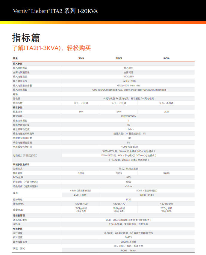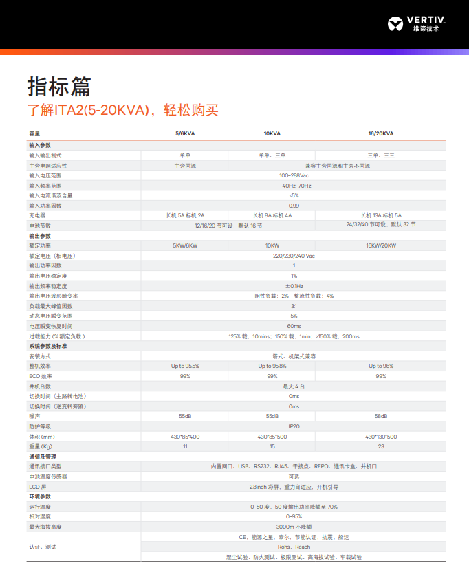 Liebert® ITA2 全系列输出功率因数提升至1,KVA=KW,带载能力提升20%以上