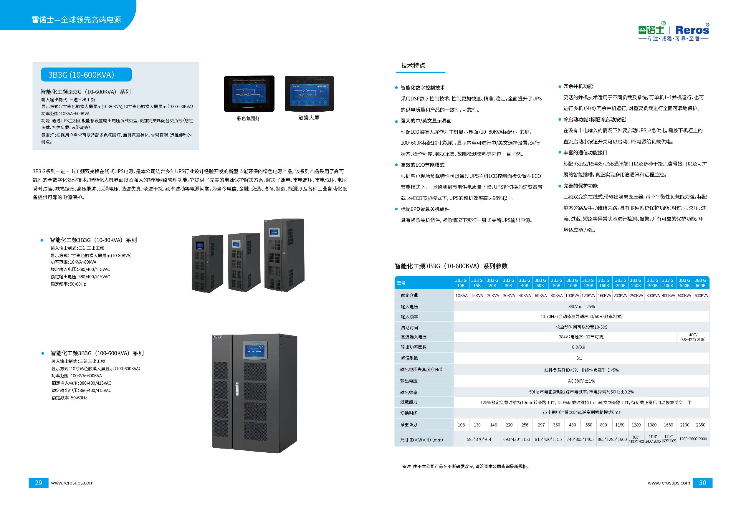 雷诺士三进三出工频3B3G(10-600K)UPS电源系统采用在线式双变换拓朴结构,内置输出隔离变压器。具备冗余并机功能,并机系统可以共用电池组,不同功率容量的UPS也能冗余并机。